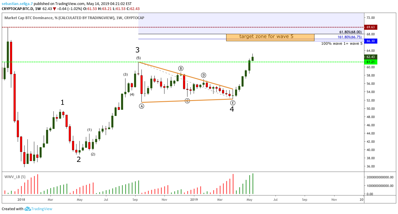Bitcoin's market capitalization relative to the total crypto market capitalization,.